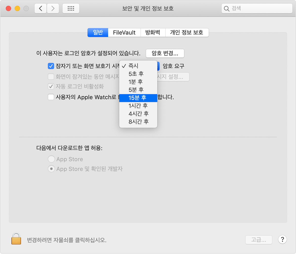일반 패널에서 '잠자기 또는 화면 보호기 시작 이후에 암호 요구'의 선택을 해제합니다. 또는 선택된 상태로 두고 팝업 메뉴에서 시간 간격을 선택합니다.